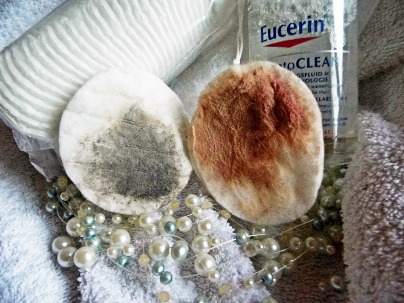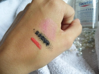I prepared a little test to show you ow efficient it is. I applied to my hand waterproof mascara, lip stain and blush. Then I put the cleansing fluid on a cotton pad and pressed the pad on my hand and wiped off. The results? Clean hand without need to wash it.