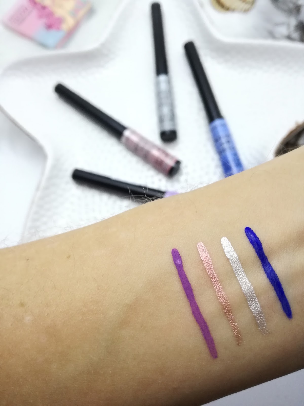 V kolekciji so tudi 4 tekoča črtala za oči. Štiri zanimive, drugačne barve. Z odlično pigmentiranostjo. Dve matt in dve metalik. Všeč so mi vsa štiri, saj so posebne in intenzivne barve. Največ bom pa verjetno posegala po metalik odtenkih, tako srebrn (Holy Crab) kot bronast (Kiss My Bubble) sta mi noro všeč in verjamem, da bosta odlična pika na i kakšnemu močnejšemu videzu. Matt vijola (Tini Bikini) in modra (Luna Lagoona) pa bosta zanimiva popestritev vsakodnevnega videza. Nanašajo se zadovoljivo, saj že pri prvem potegu dobim barvo, kakršna naj bi bila. Edina malenkost, ki me moti je čopič – zame je namreč malenkost predolg, ampak se ga da vseeno obvladat in naredit lepo črto.