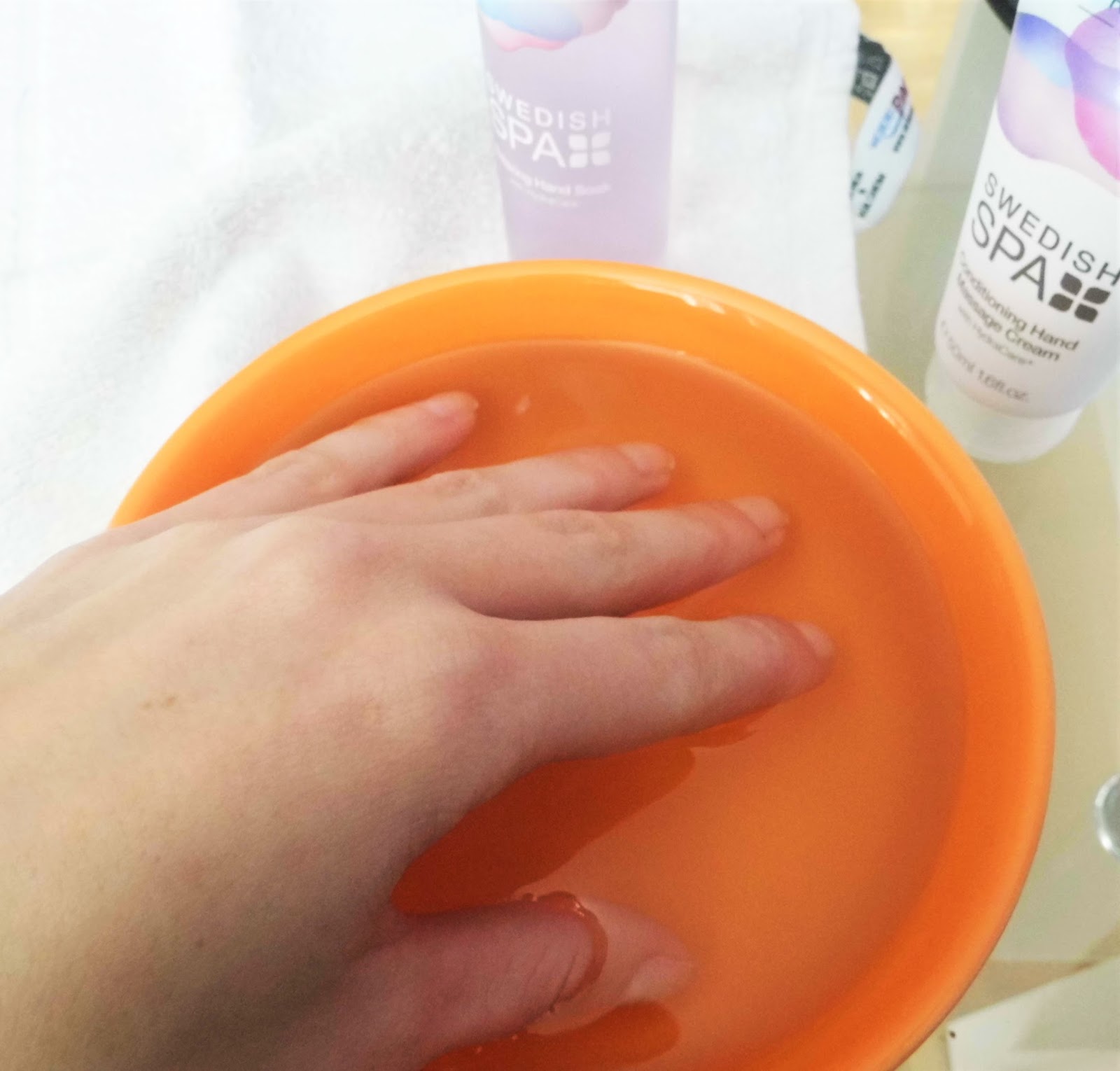I put a few drops of it in warm water and then put my hands in said water for around 5-10min. The smell is gentle and not too strong, it smells fresh and reminds me of cologne. I like it since it is really faint but it doesn’t stay on my skin. Hand soak is great, it softens my cuticles nicely so I can easily push it back.