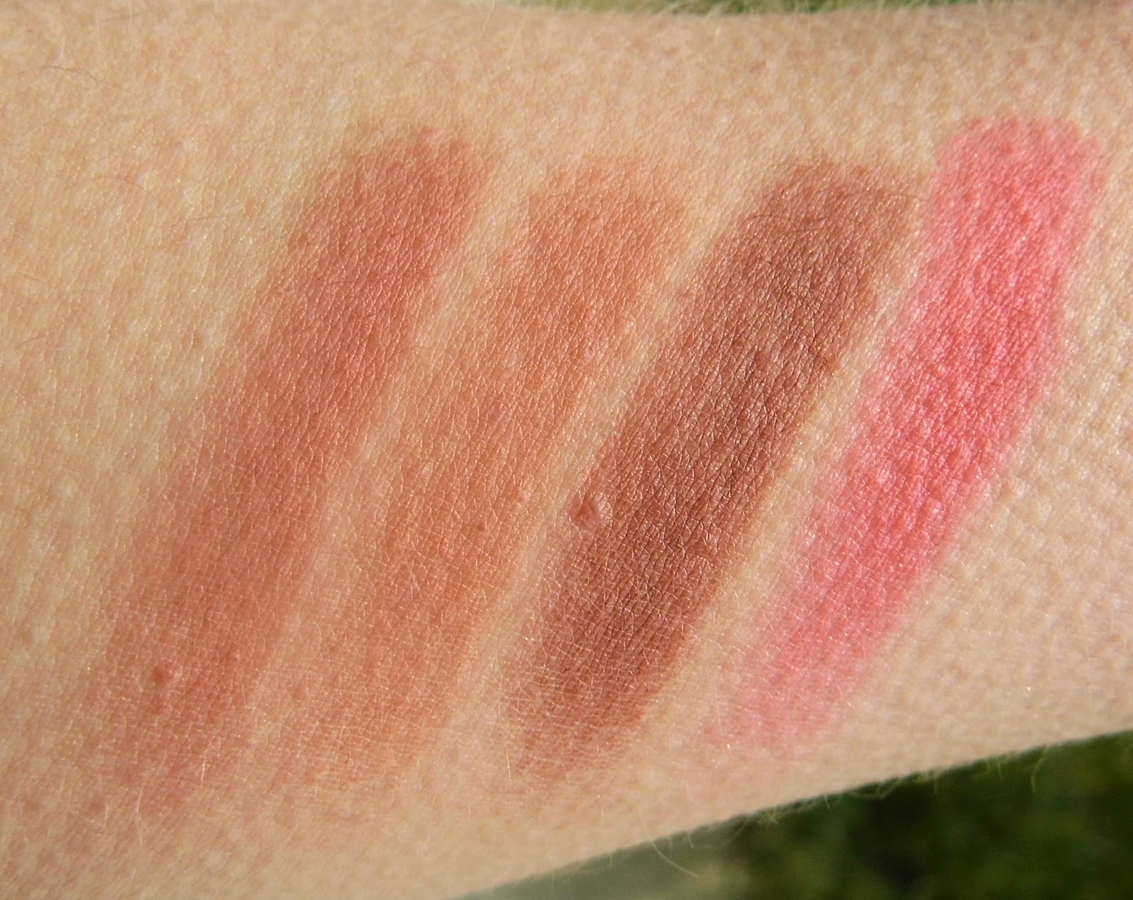 Both matte shades are very useful for contouring. Dark shimmer brown is great as a bronzer and the pink can be used as a blush.